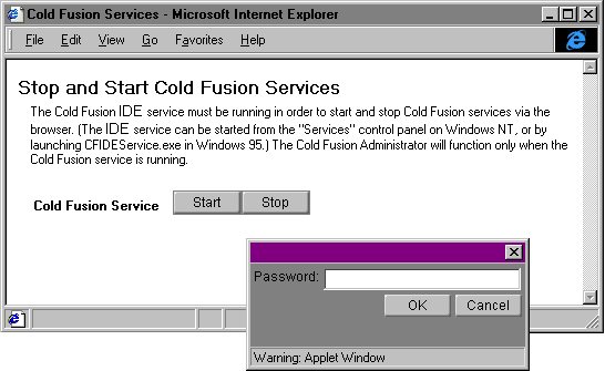 Normally, ColdFusion services are started during ColdFusion setup and configured to run whenever you start your system. However, if you need to start ColdFusion services, click the Start-Stop icon in the ColdFusion program group. If a password is configured for the Administrator, you will be prompted to enter a password before you can start or stop ColdFusion services.