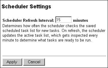 To change the interval ColdFusion checks for newly scheduled tasks, enter an interval value, in minutes. After changing the Scheduler refresh interval, make sure you stop and restart the ColdFusion Executive and ColdFusion Application Server services (Windows NT) or run the stop and start scripts (Solaris).