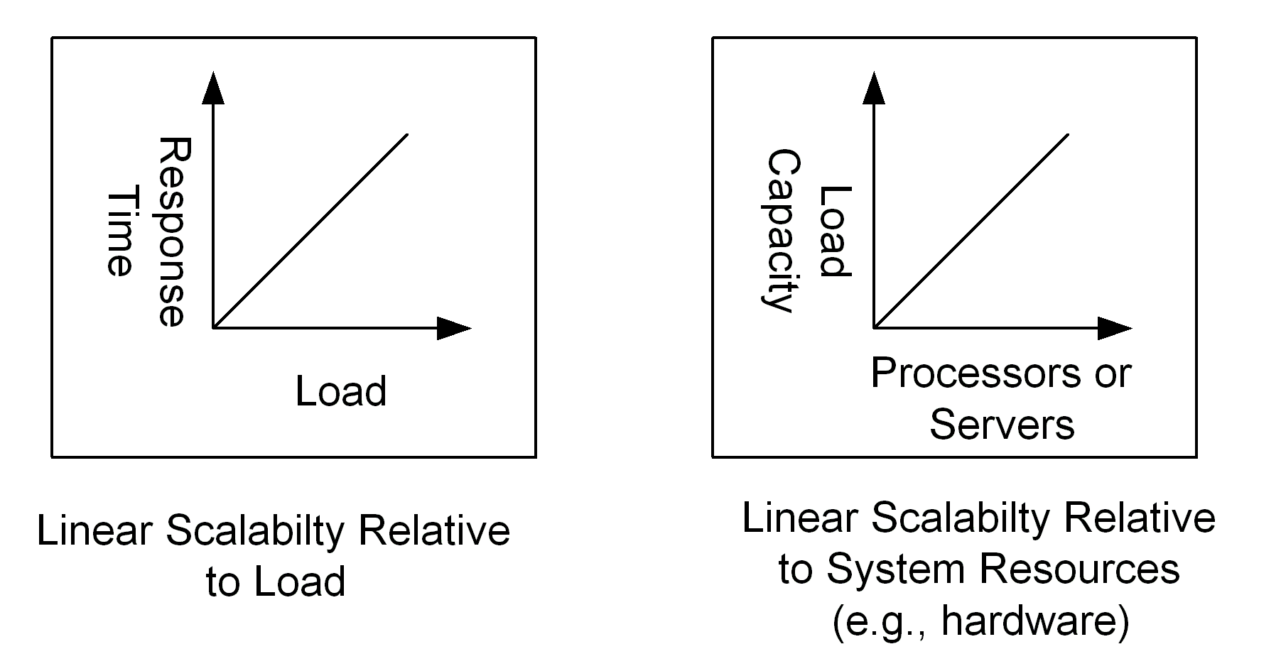 Perfect scalability -- excluding cache initializations -- is linear. Linear scalability, relative to load, means that with fixed resources, performance decreases at a constant rate relative to load increases. Linear scalability, relative to resources, means that with a constant load, performance improves at a constant rate relative to additional resources.
