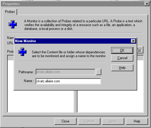 The New Monitor dialog box appears in front of the Probe Properties dialog box.