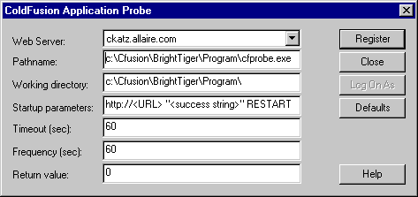 | Note | Don't set the Timeout and Frequency interval values too low (below 60 seconds) because if the intervals are extremely narrow, they may cause the ColdFusion Server to reboot inadvertently (due to network congestion, for example) rather than detecting an actual failure on the ColdFusion Server. Allaire recommends you set your Timeout and Frequency intervals to 120 seconds. |