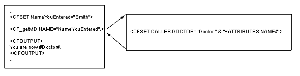 <CFSET CALLER.DOCTOR="Doctor " & "#ATTRIBUTES.NAME#"> | See below. (It is helpful to look at this code from right to left.) |