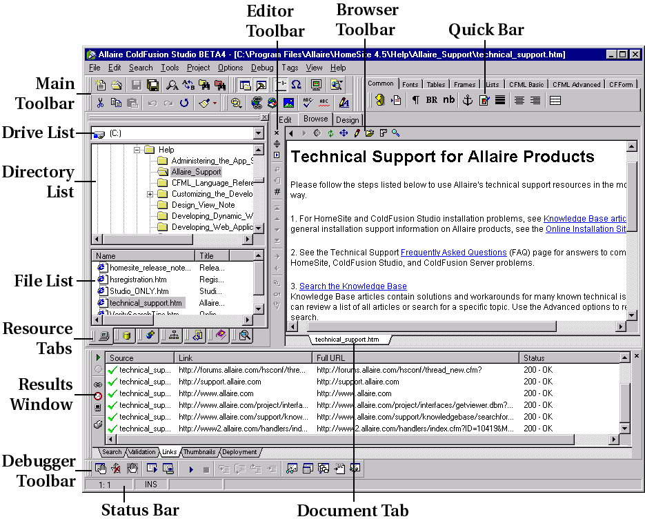 Studio offers a highly customizable interface; you can set it up to suit your work style. Nearly all of the workspace elements are movable, so you can move panes and toolbars and dock them in new locations. The main workspace areas are shown below.