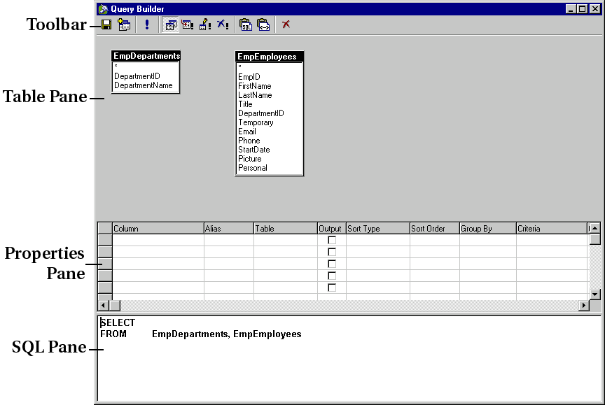 - Table pane -- Provides a view of the tables in your query and allows you to create joins between tables.