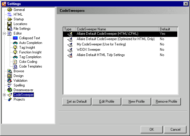 - General settings and Tag-specific settings can be set for each Allaire CodeSweeper. Note that general settings are not global. You can specify different general settings for each CodeSweeper.