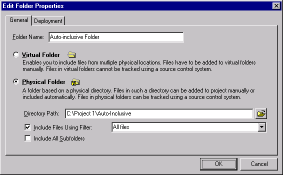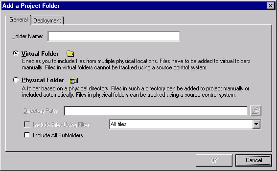 There are some limitations to where you can add virtual folders. Virtual folders can only be added to the project root or to another virtual folder. You cannot add a virtual folder to a manual-inclusive or auto-inclusive folder. You can, however, add manual-inclusive or auto-inclusive folders to virtual folders.